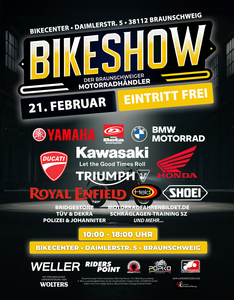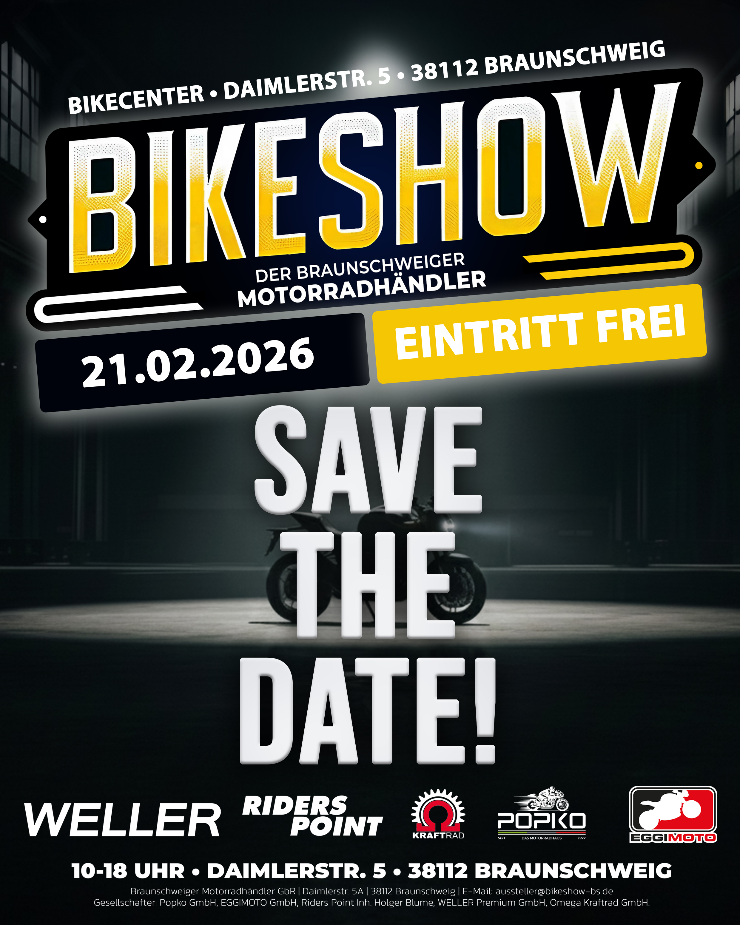 Als die Hausmesse der Braunschweiger Motorradhändler ist die Bikeshow im Bikecenter bereits seit 2023 ein voller Erfolg gewesen. Für 2026 haben wir neue Marken und Aussteller an Bord. Der Eintritt ist frei. Wir freuen uns auf Euch!